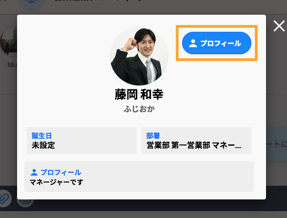 また、トークやタイムラインに表示される[アイコン]→[プロフィール]をクリックでもプロフィールを見ることができます。