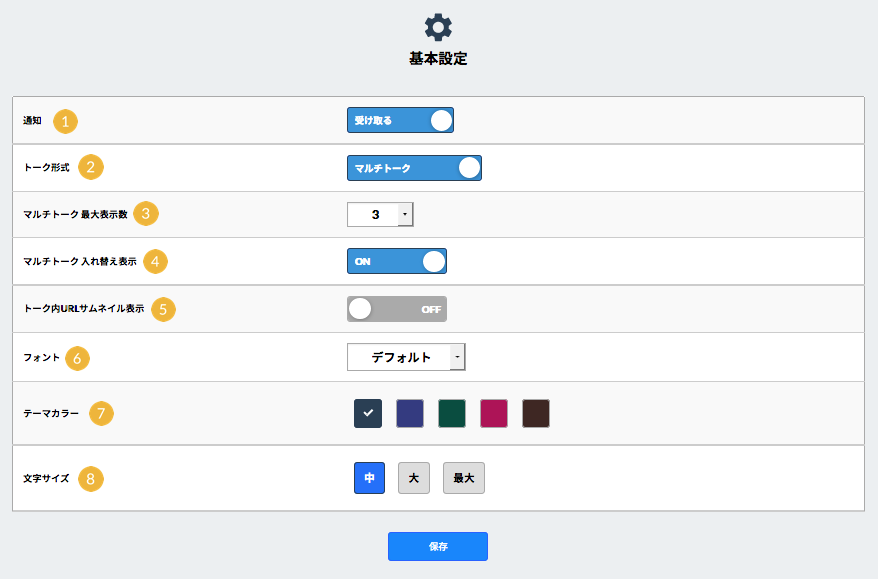 基本設定を確認する 基本設定を確認する 各種基本設定を確認するには、メニューバーの「 」をクリックし[ 基本設定]をクリックします。 1 デスクトップ通知の有無を設定することができます。詳しくは「通知の有無を設定/変更する」をご覧ください。 2 [シングルトーク]、または[マルチトーク]かを選択することができます。詳しくは「トーク形式を設定/変更する」をご覧ください。 3 マルチトークの最大表示数を設定することができます。詳しくは「トーク形式を設定/変更する」をご覧ください。 4 マルチトークの入れ替え表示を設定することができます。詳しくは「トーク形式を設定/変更する」をご覧ください。 5 トーク内のURLの表示形式を設定することができます。詳しくは「トーク内のURL表示形式を設定/変更する」をご覧ください。 6 文字のフォントを設定することができます。詳しくは「フォントを設定/変更する」をご覧ください。 7 テーマカラーを設定することができます。詳しくは「テーマカラーを設定/変更する」をご覧ください。 8 文字サイズを設定することができます。詳しくは「文字サイズを設定/変更する」をご覧ください。 フォームでのお問合わせ ご質問・ご不明点については、お問合わせフォームよりお気軽にお問合せください。 お問合せフォーム
