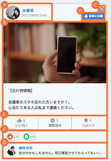 詳しくは下記の「投稿の詳細の見方」をご覧ください。 E [いいね!]数、[確認済み]人数、[コメント]数を確認することができます。
