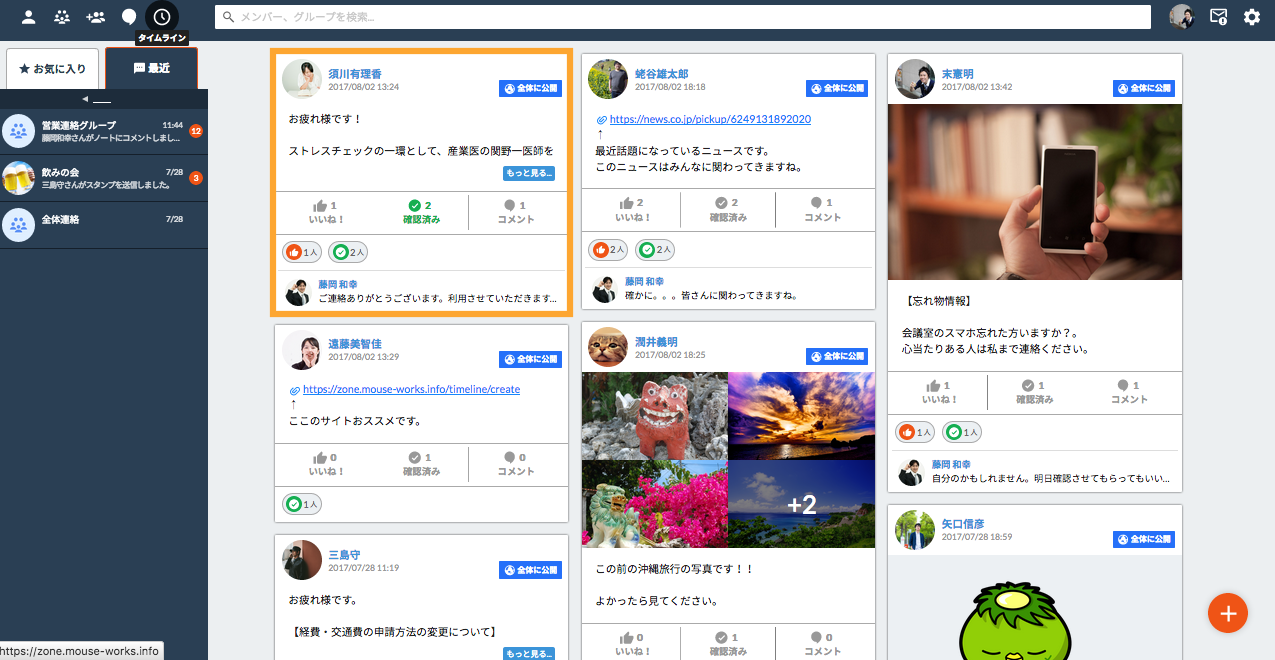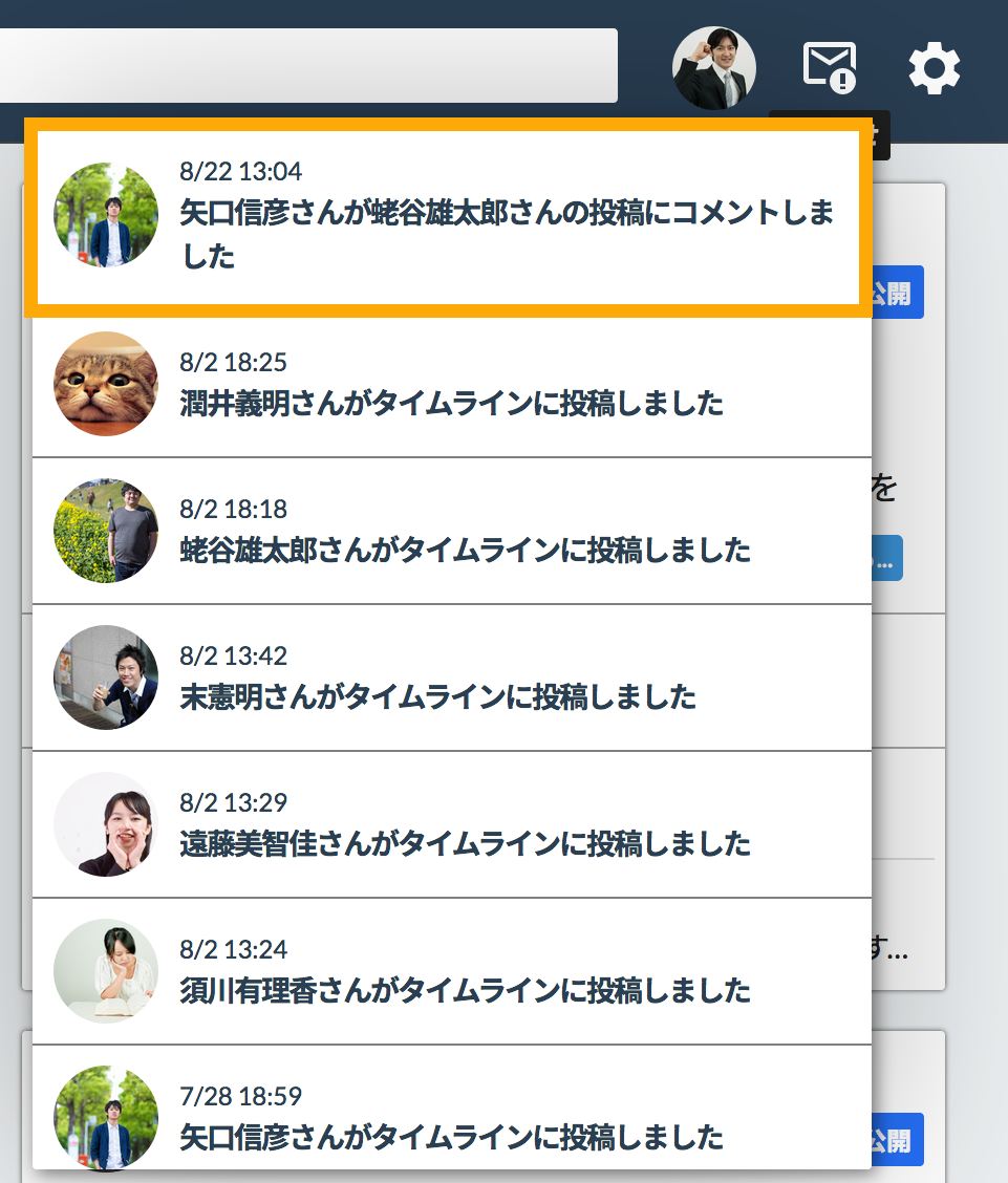 また、お知らせをクリックすることでも見ることができます。お知らせについて詳しくは「タイムラインのお知らせを見る」をご覧ください。