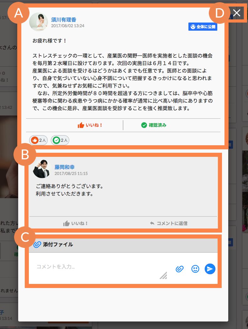 投稿に対するコメント内容です。投稿者、投稿日時、メッセージ、ファイル、画像、スタンプが表示されます。