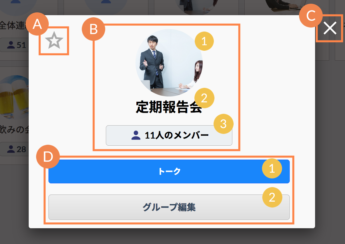 ※1:トークリストの詳細については「トーク画面の使い方」をご覧ください。 B グループの基本情報です。 1 グループのアイコンです。 2 グループ名です。 3 グループのメンバー数です。 C グループ詳細を閉じます。 D グループメニューです。グループトークやグループの編集をすることができます。 1 グループトークをすることができます。
