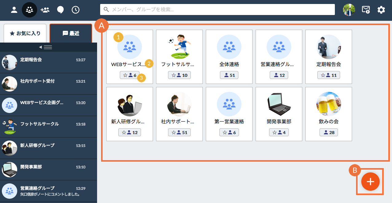 詳しくは、次節の「グループ詳細の見方」をご覧ください。 1 グループのアイコンです。 2 グループ名です。 3 グループのメンバー数です。 B グループ新規作成画面に移動します。詳しくは「グループを作成する」をご覧ください。