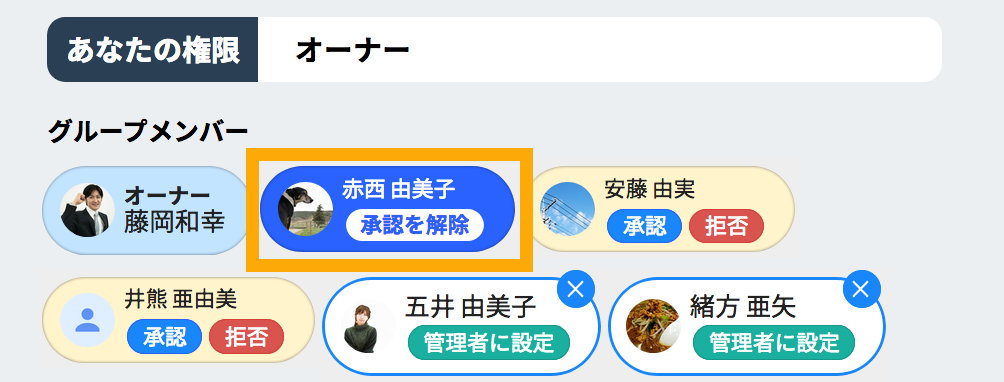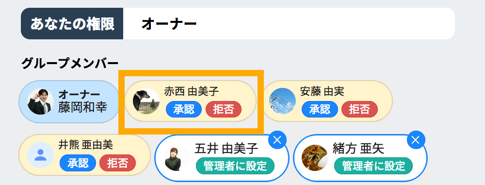 オーナーまたは管理者はグループに招待されたメンバーを承認することができます。