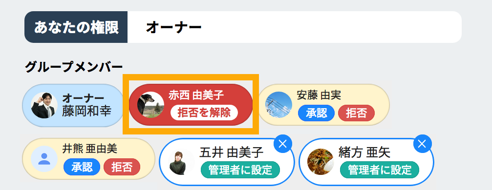オーナーまたは管理者はグループに招待されたメンバーを拒否することができます。