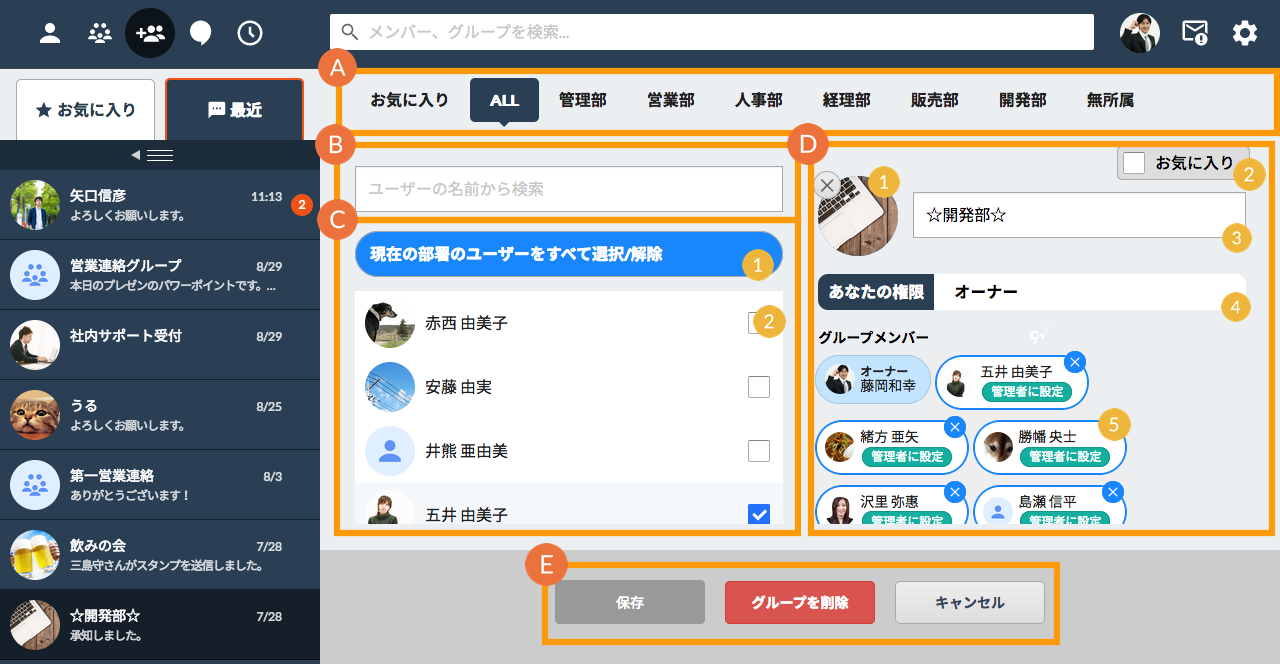 部署一覧タブです。部署ごとにメンバーの絞り込みができます。