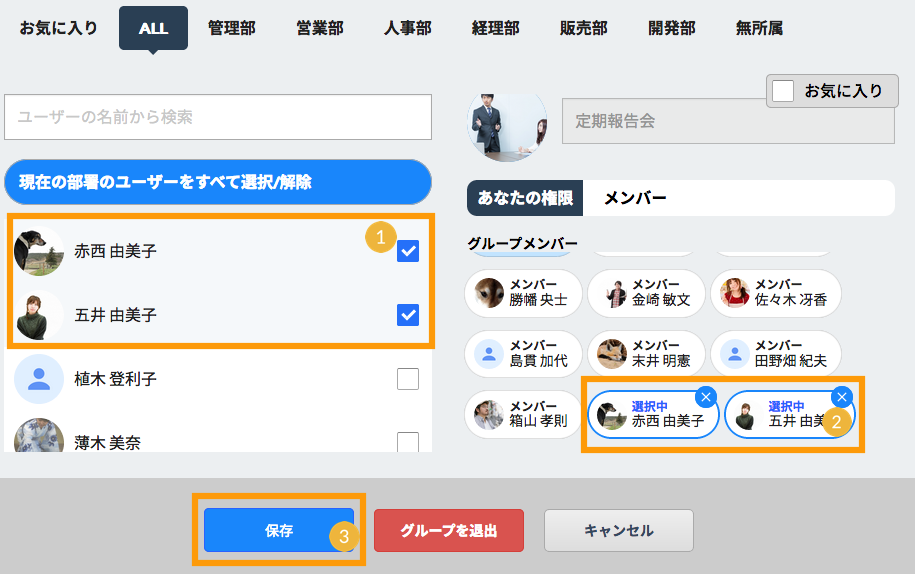 2選択したメンバーが右側の「グループメンバー」に追加されたことを確認します。