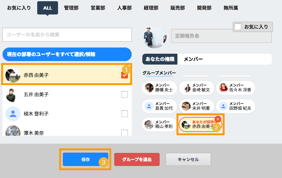 3「グループメンバー」のリストから除外したら、[保存]ボタンをクリックして招待の取り消しが完了します。