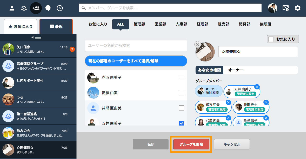 グループ編集画面で[グループを削除]ボタンをクリックするとメッセージが表示されます。