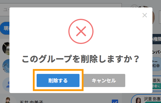 メッセージを確認し[削除する]ボタンをクリックするとグループが削除されます。