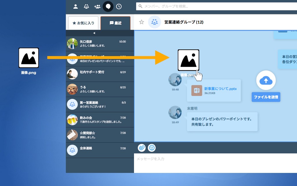 また、トークに画像をドラッグ&ドロップすることでも画像を送信することができます。