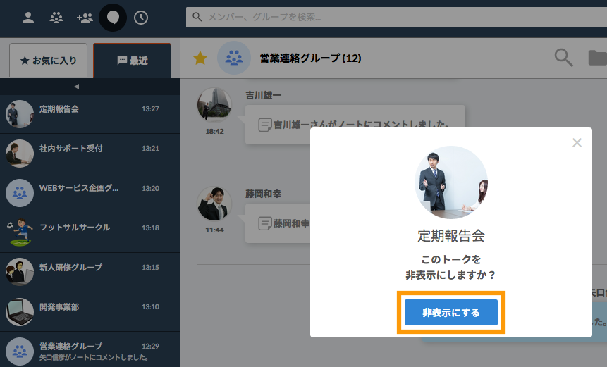 トークを非表示にするかを確認するメッセージが出るので[非表示にする]をクリックしてください。