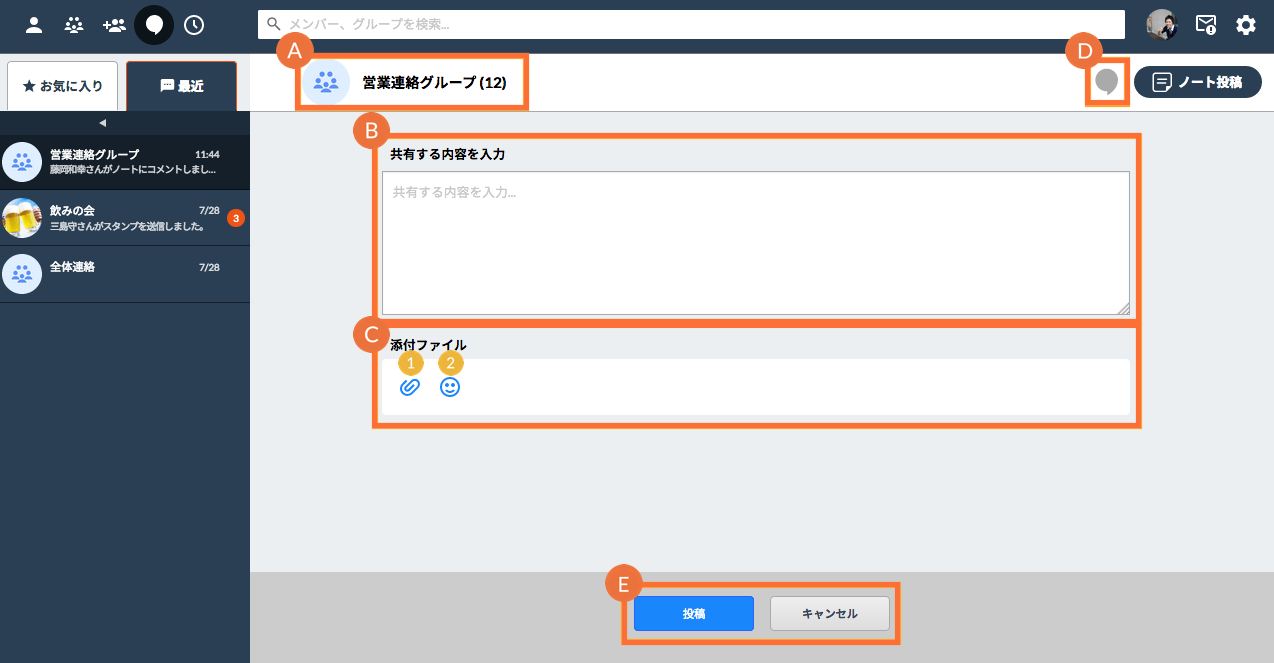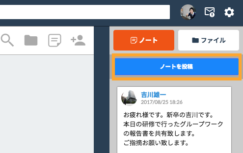 ノート投稿画面を開くにはトークルーム内の[ノートを投稿]をクリックします。